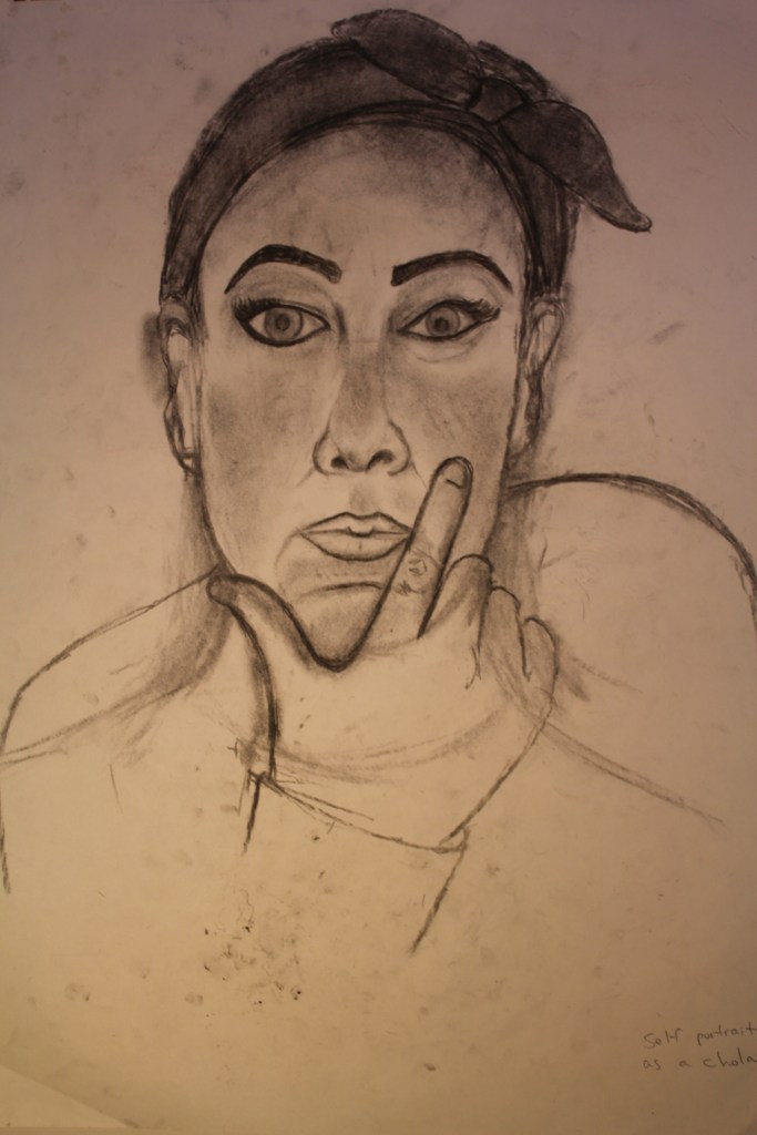 Self-portraits, self conscious ‘Self Portrait With Toothbrush’ 199824″x18″ pencil ‘Self Portrait As Chola’ 202024″x18″ charcoal ‘Thing’s I Keep Hidden’ 199924″x18″ charcoal ‘Weighing My Options,Potential’ 200924″x18″ pencil ‘Self Portrait’ 201624″x18″ pastel ‘Self Portrait, Splintered’ 199924″x18″ pencil ‘Shorn’ 2011 18″x12″ pencil ‘Self Portrait, Sickly’ 201924″x18″ pastel ‘Hmm …Self Portrait’ 201124″x18″ charcoal ‘Self Portrait’ 201612″x9″ charcoal ‘Self Portrait’ 201912″x9″ pencil ‘Self Portrait’ 200912″x9″ pencil ‘Self Portrait’ 200924″x18″ charcoal ‘Fire Sign’ 201624″x18″ pastel and pencil ‘Alien Self’ 201024″x18″ pencil ‘Unfinished’ 201012″x9″ pencil ‘Yea, I Beat Myself Up Sometimes’ 2012 Share this: Click to share on X (Opens in new window) X Click to share on Facebook (Opens in new window) Facebook Like Loading...